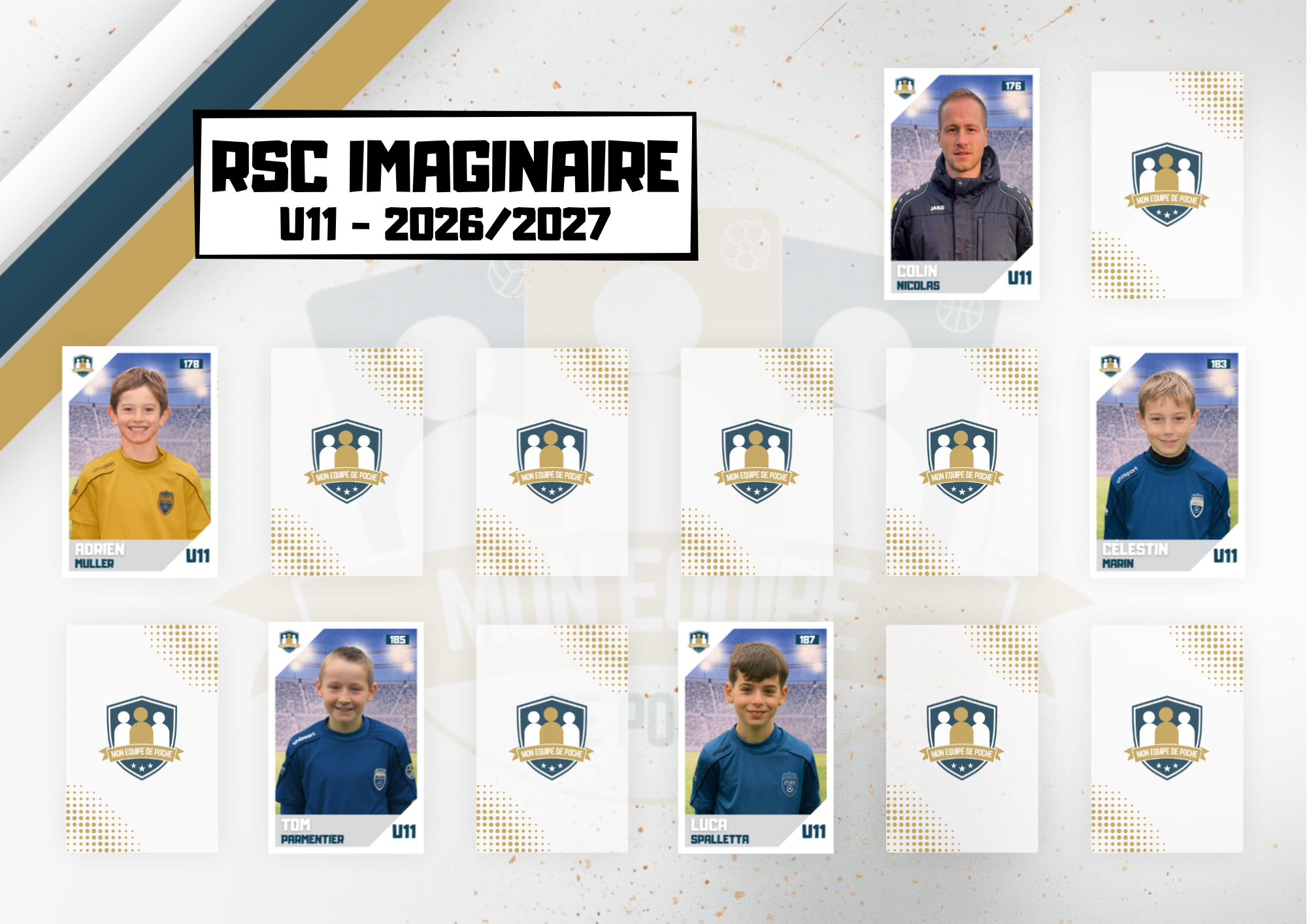 Un poster personnalisé de votre équipe est également inclus, adapté au nombre de membres (joueurs, entraîneur(s), kiné, préparateur physique, …), pour y coller vos cartes et créer un souvenir unique.